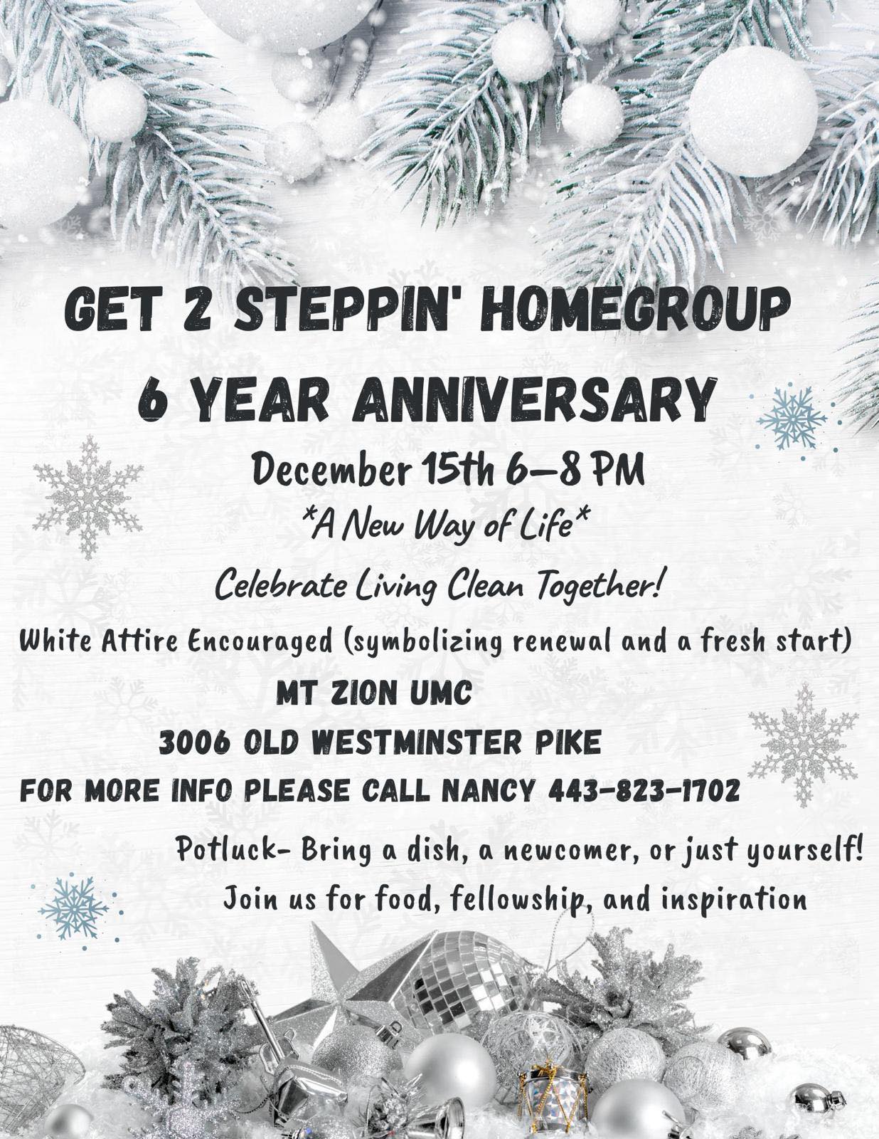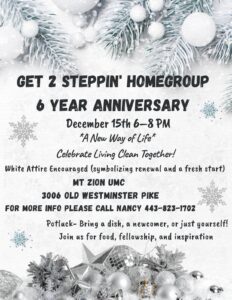 Join the Get 2 Steppin’ Homegroup as we celebrate our 6-year anniversary on December 15th from 6–8 PM at Mt. Zion UMC (3006 Old Westminster Pike). This is a potluck event—bring a dish, a newcomer, or just yourself—and enjoy food, fellowship, and inspiration as we celebrate living clean together. White attire is encouraged as a symbol of renewal and a fresh start. For more information, please contact Nancy at 443-823-1702.
